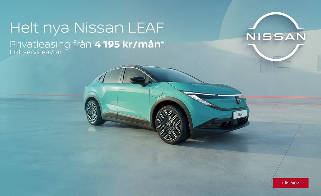 Nissan LEAF, en helt eldriven familjebil. Privatleasing från 4 195 kr/mån. Med generösa batterialternativ på 52 eller 75 kWh får du en elbil som kombinerar räckvidd på upp till 622 km med smidig vardagskörning. De dubbla 14,3-tums skärmarna ger en modern och intuitiv upplevelse där all information alltid är nära till hands. Nissan LEAF förbrukning WLTP blandad körning. kWh/100 km: 13,7-14,7 CO2-utsläpp g/km: 0. Erbjudandet gäller fram till 31.03.2026 och går ej att kombinera med andra avtal eller rabatter. Med reservation för eventuella förändringar. Bilen på bilden är extrautrustad. För mer information kontakta din Nissan-agent. *Privatleasing av modell Nissan LEAF erbjuds genom Arval. Månadskostnad från 4 195 kronor. Leasingavgiften per månad beror på vald modell/version, årlig körsträcka och övriga tillägg som t.ex. däck och försäkringar. Priset inkluderar service och underhåll. Minsta totalkostnaden som uppgetts ovan inkluderar inte däck, fordonsskatt och obligatorisk försäkring och är baserad på 10.000 km/år och 36 månader. Leasingkostnaden är fast under hela kontraktsperioden, med en fast räntekostnad. Ingen uppläggningsavgift eller administrationsavgift tillkommer. Kampanjerbjudandet inklusive priser, gäller fram till 31.03.2026, på ett begränsat antal bilar. Nissan och Arval förbehåller sig rätten att, när som helst och utan förvarning, ändra eller avsluta kampanjen. Godkänd kreditvärdighet och kundkännedomsanalys är ett krav för att teckna ett leasingavtal med Arval.