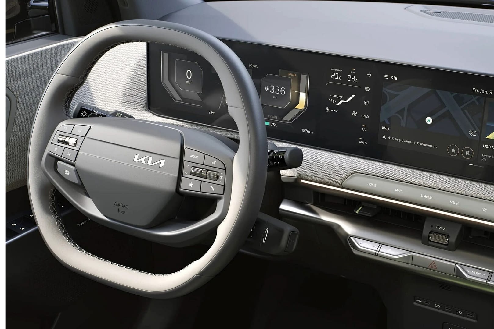 Kia EV9 erbjuder 6 eller 7 sittplatser som skapar en känsla av ett mobilt vardagsrum och där materialvalen är gjorda med respekt för vår omgivning.