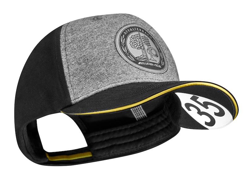 Baseballkepsen med 5 paneler är designad i svart och gråmelange och är tillverkad av 100 % bomull för ökad komfort. Slutligen kan AMG-kepsen justeras perfekt efter huvudets form tack vare det silverfärgade spännet. Huvudbonaden är även snygg, med sandwich i kontrasterande gul färg, gula kontrastränder på justeringsbandet och en skärm med ”35” tryckt på undersidan. Ett snyggt Affalterbach-emblem på framsidan och en silverfärgad broderad AMG Classic-logotyp bak avrundar kepsens sportiga design.