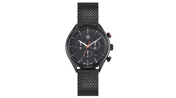 Herruret med en boett i rostfritt stål med svart ytbehandling imponerar med sitt moderna utseende och gör att man har koll på tiden. Den svarta urtavlan har silverfärgade luminiscerande visare som garanterar bekväm avläsning av timmar och minuter även när det är mörkt. Den speciella designen understryks av en upphöjd Mercedes-stjärna som är placerad vid klockan 12.00. Datumvisning samt en praktisk stoppfunktion rundar av det sportiga urets utförande. Tack vare att uret är vattentätt till 10 ATM kan det även bäras utan problem när man simmar eller snorklar. Uret drivs av ett kvartsverk Ronda 5030 och är dessutom bekvämt att bära. Det senare garanteras av det flätade Milanese-armbandet av rostfritt stål med gulguldfärgad PVD-ytbehandling.