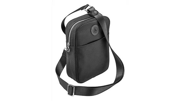 Axelväskan i återvunnen polyamid är en mångsidig följeslagare med plats för de viktigaste sakerna. Väskan har också ett stort huvudfack med en separat ficka med blixtlås. Det finns också en liten fyrkantig ficka för en spårningstagg upp till en maximal storlek på 40 mm x 40 mm. En avtagbar bärrem, som kan justeras individuellt i längd, gör den bekväm att bära. De silverfärgade blixtlåsen och blixtlåshänget med 3D-stjärna är en snygg kontrast mot den svarta nylonväven. En speciell detalj är den tydliga varumärkningen, som ger axelväskan en exklusiv touch. Både logotyphänget och övriga läderapplikationer på axelväskan är tillverkade av samma läder som även används för säten och utrustning i den exklusiva interiören i Mercedes-Benz S-Klass.