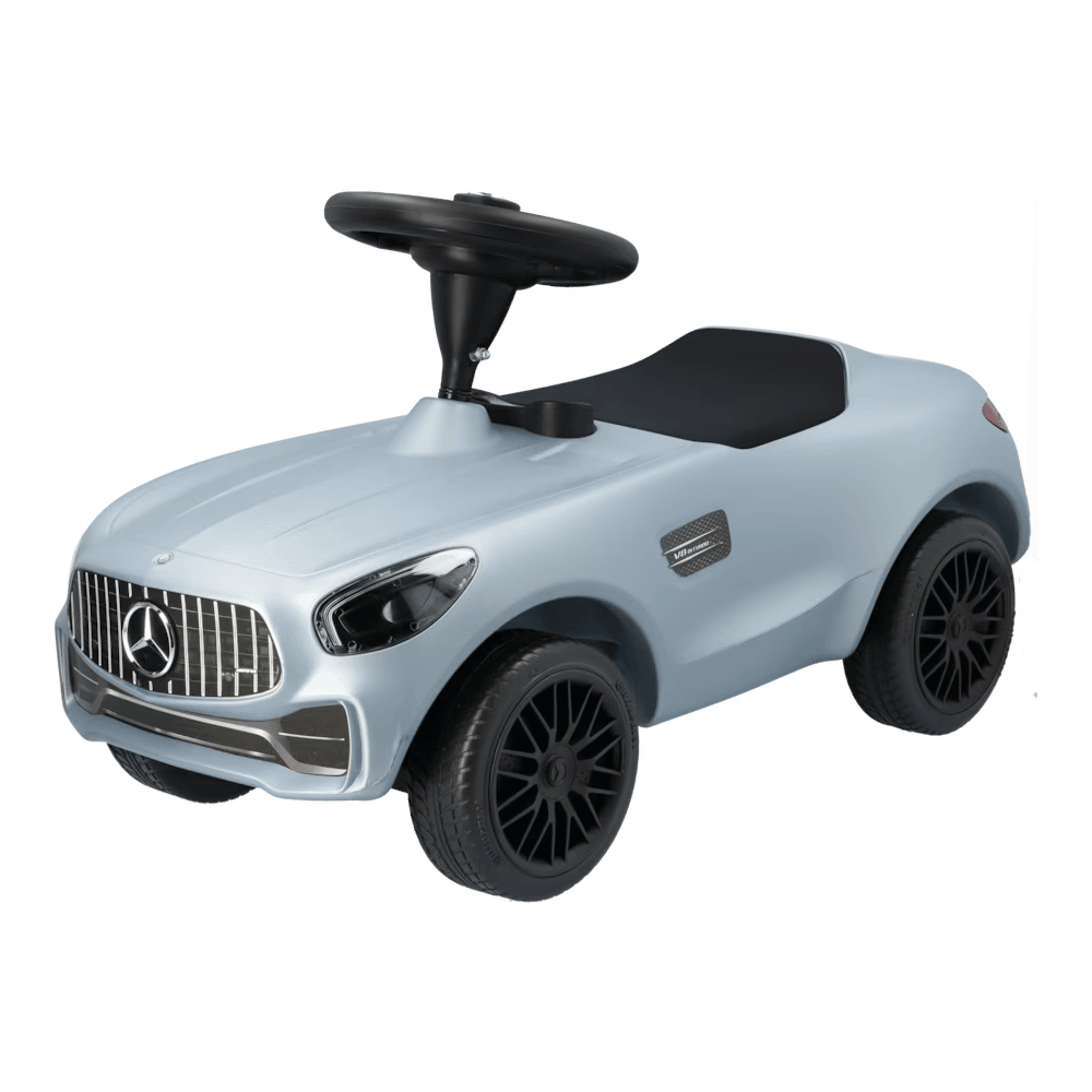 Den silverfärgade gåbilen är inspirerad av Mercedes-Benz SLS AMG och lämpar sig för barn från 18 månader. Modellen är tillverkad av robust plast och har en ergonomisk förarplats med sittdyna i svart cellplast. Den har även steglös precisionsstyrning med hjulspindlar och en nätt vänddiameter. Ratten i Mercedes-AMG GT-design med svart eker ger bra grepp och manövrering, medan de detaljerade strålkastarna och baklyktorna i klarglas, de tystgående däcken med mönster och de originaltrogna smidda AMG-fälgarna i kryssekerdesign avrundar den stilsäkert komponerade designen. Barnbilen levereras med monteringsanvisning och en dekalkarta.
